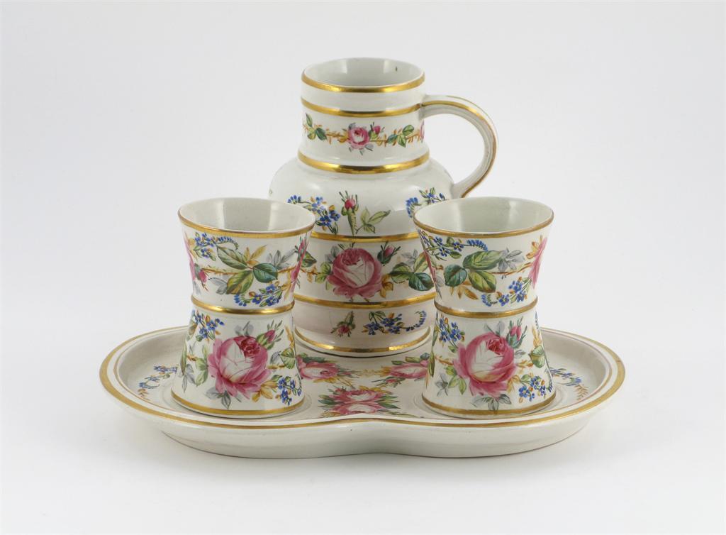 A George Jones bedroom tray, of trefoil form, with a water jug and two beakers, all painted with bands of pink roses, blue flowers and corn, impressed monogram to the base of the tray, 2nd half 19th century, some restoration, 30cm max. (4)
