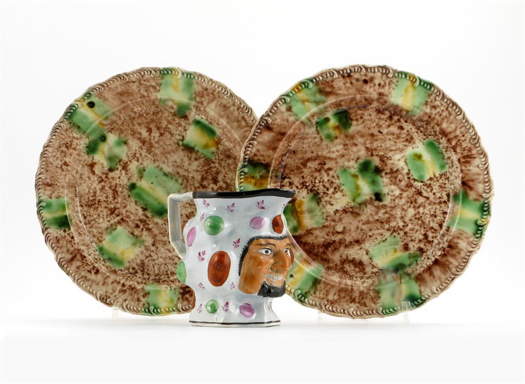 A pair of creamware plates, decorated in a Whieldon-type glaze with green and ochre dashes on a mottled brown ground, and a pearlware jester jug, moulded with a bearded face between random colourful knobbles, late 18th / early 19th century, 23.2cm max. (3)