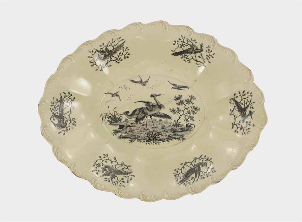 A Wedgwood creamware oval dish, with feather-moulded border, printed in black by Sadler & Green with birds in flight and standing beside water, within six vignettes of birds perched on branches, incised X to the base, c.1770, minute chipping to the rim, 30.2cm.