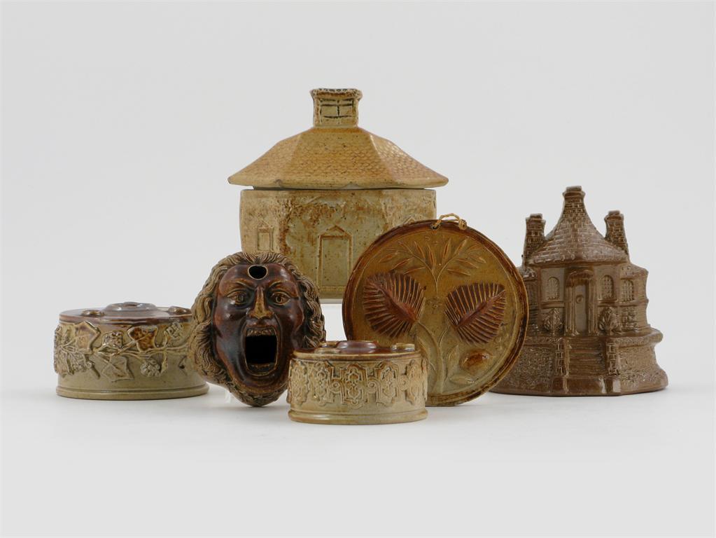 Three brown stoneware inkwells, two circular and banded with grapevine and flowerheads, the third modelled as a man's face, a stoneware moneybox in the shape of a house, a house box and cover, and a butter press, most 19th century, 11cm max. (7)