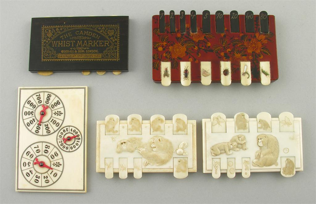 A pair of Japanese carved ivory Whist markers, the tops relief decorated monkeys, 3.5in (9cm) l, an ebonised and ivory marker 'The Camden Whist Marker, Goodall & Son:London', a lacquer Bezique marker, the ivory pegs with applied insects, the ebonised pegs numbered and an ivory marker, having three numbered dials, the reverse with foliage. (5)