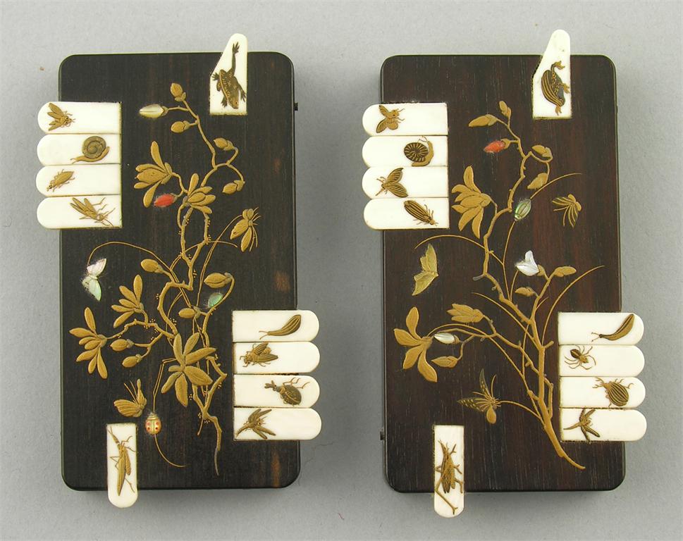 A pair of Japanese shibayama Whist markers, the rosewood tops with gilt branches with coral and mother-of-pearl insects, to ten ivory pegs decorated insects and a toad, c.1900, 3.5in (9cm) l. (2)