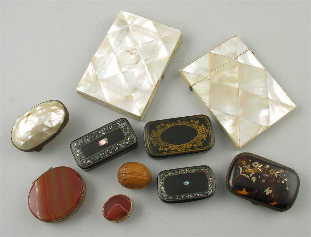 Two Victorian mother of pearl card cases, both of diamond quilt designs, one with engraved garter and border hinging to concertina pockets, 4.24 x 3in (10.8 x 7.6cm), a tortoiseshell and inlaid purse, three papier mache snuff boxes, two oval onyx and brass mounted boxes, a shell box and small nut.