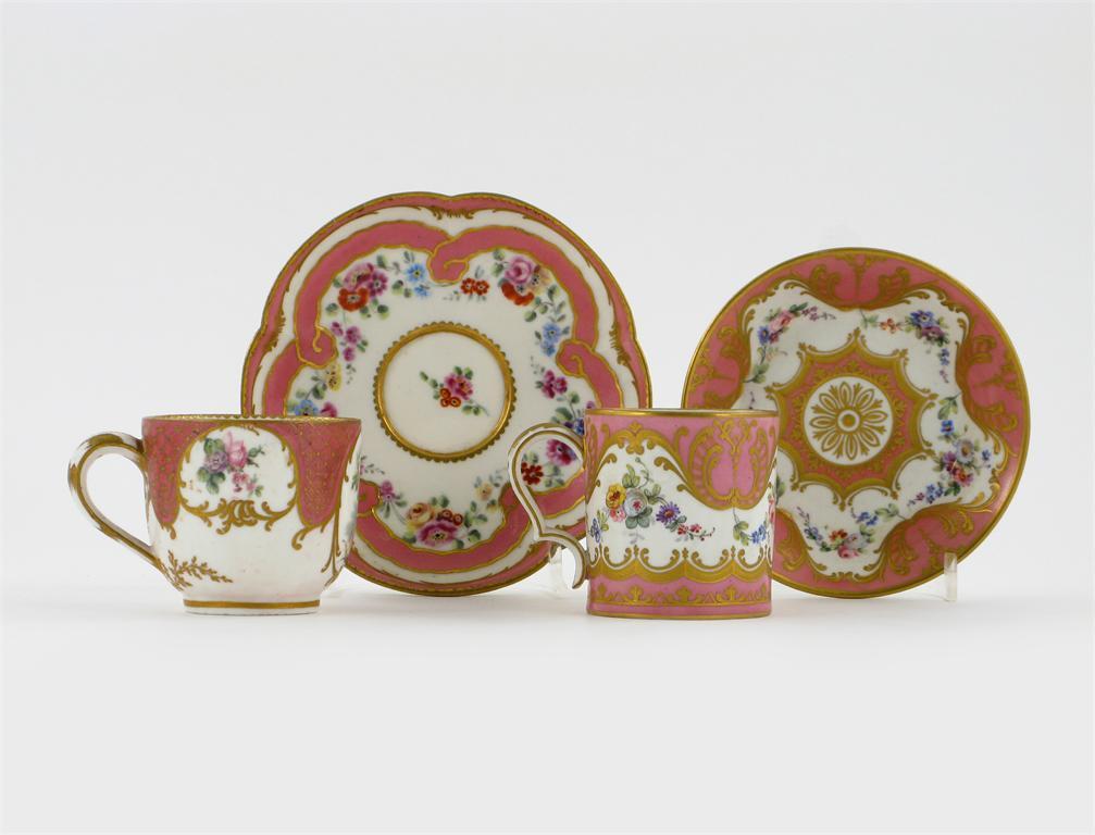 Two Sèvres-style cups and saucers, painted with floral garlands and an exotic bird, each on a pink ground gilded with stylized foliage and diaper designs, 2nd half 18th century and later. (4)