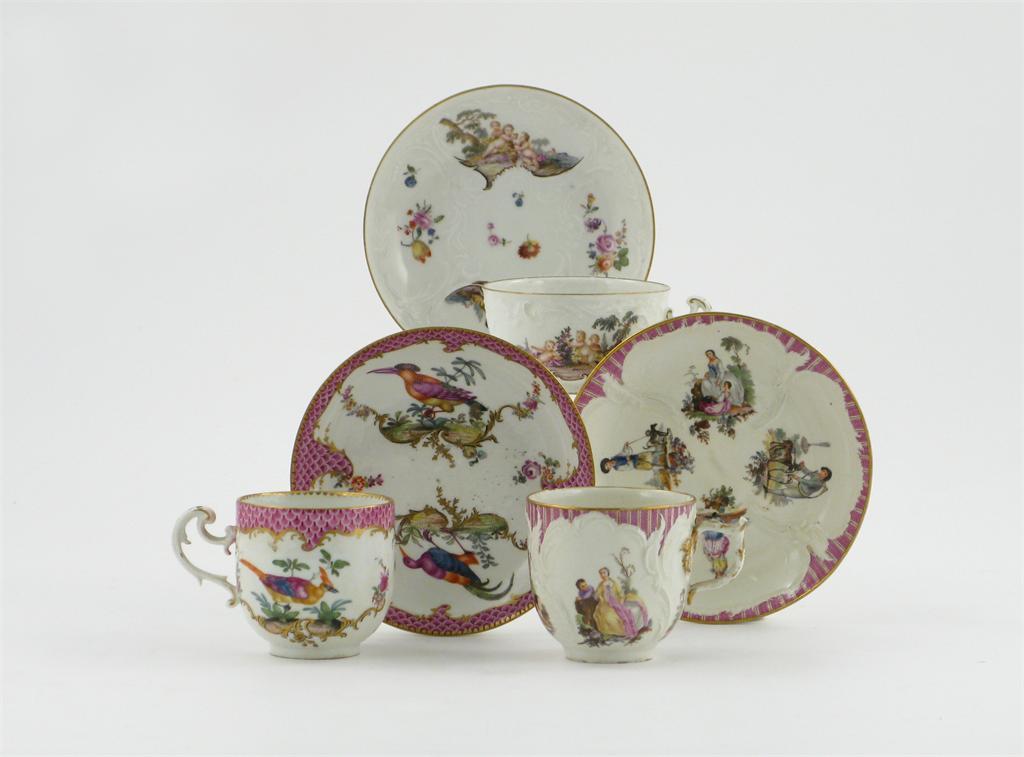 Two Meissen cups and saucers, one rococo-moulded and painted with panels of putti and flowers, the other brightly painted with colourful birds on a pink scale border, and a Berlin cup and saucer, painted with figures at various pursuits, blue crossed swords and sceptre marks, mid 18th century, 14cm. (6)