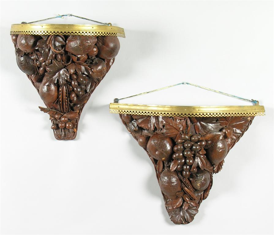 Two continental leather fruit brackets, naturalistically modelled with a shaped top, having an applied pierced brass frieze, 14in (35.5cm) h, 18in (46cm) w, 6.5in (16.5cm) d.