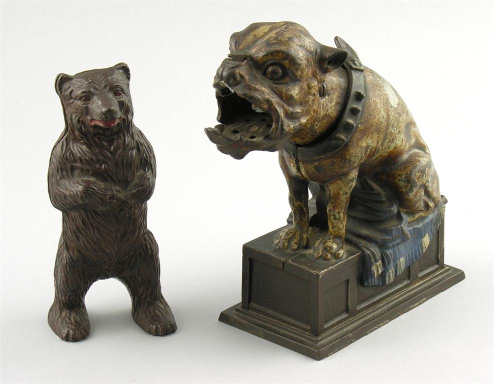 A painted cast iron 'Bull Dog Bank,' 7.5in (19cm) h, and another modelled as a standing bear, 6.25in (16cm) h. (2)