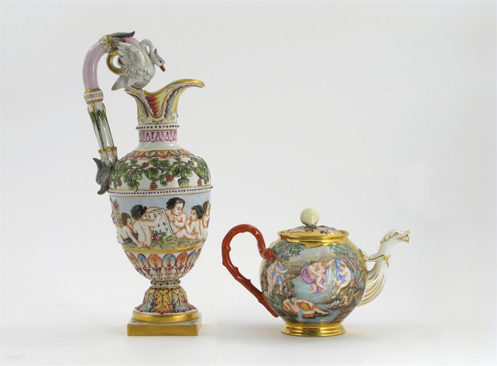A Doccia-style teapot and cover, moulded and brightly painted with maidens bathing and couples cavorting in a stream, and a similar ewer, moulded with putti emblematic of the Arts, Science, Maths and Geography, 19th / 20th century, 30cm max. (3)
