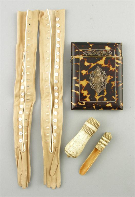A 19th century turned bone apple corer, 5.25in (13.4cm) l, a Victorian tortoiseshell and silver coloured metal inlaid card case, 4.25in (10.8cm) h, and a pair of miniature long kid gloves, with mother-of-pearl buttons, 11in (28cm) l. (4)