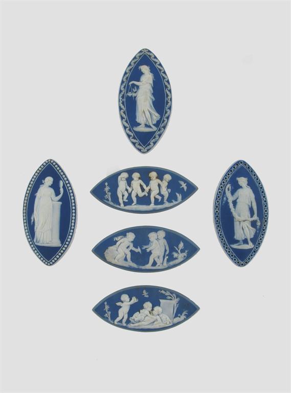 Six Wedgwood Jasperware cameo plaques, three decorated with putti at play with birds and butterflies, three with Classical maidens within borders of acanthus leaf, dots and pierced flowerheads, impressed 'WEDGWOOD', late 18th century, one broken in half and repaired, 6.5cm. (6)