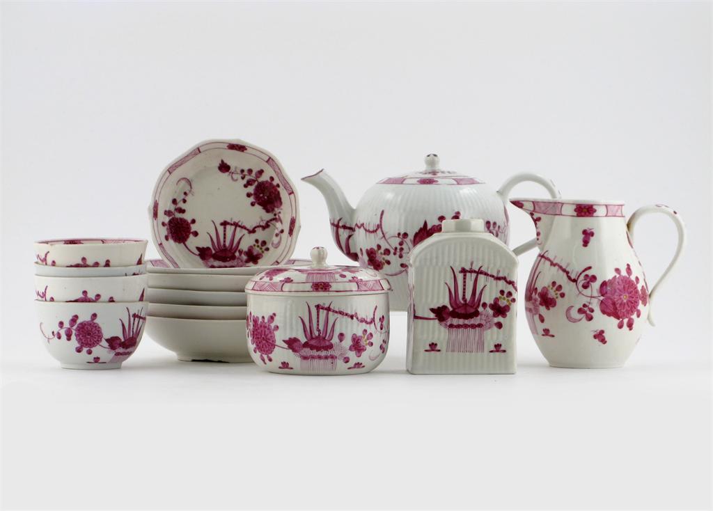 A Limbach part tea service, painted in puce with a banded fence amidst chrysanthemum and other Oriental flowers, c.1780, minor faults. Comprising: a teapot and cover, a sugar bowl and cover, a jug, a tea canister, a stand, four teabowls and five saucers. (16)