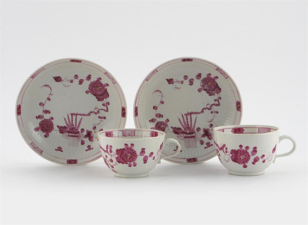 A pair of Limbach cups and saucers, painted in puce and gilt with a banded hedge issuing chrysanthemum, painted clover leaf marks, late 18th century, 13.2cm. (4)
