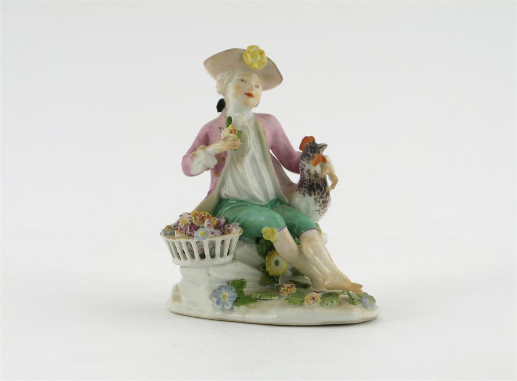 A Meissen model of a seated boy, his bare legs outstretched upon the flower encrusted pad base, his left arm draped around the neck of his cockerel, his right hand plucking blooms from a reticulated basket by his side, a faint crossed swords mark to the reverse, mid 18th century, a little good restoration, 11cm.