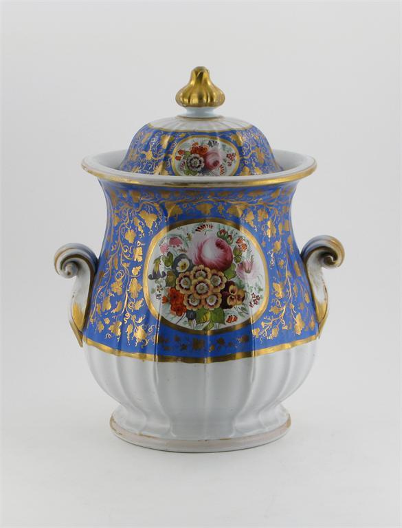 An ironstone water cistern and cover, the ribbed body painted with panels of English flowers on a blue ground with a scrolling gilt vine, printed factory mark, 1st half 19th century, some restoration, 42cm. (2)