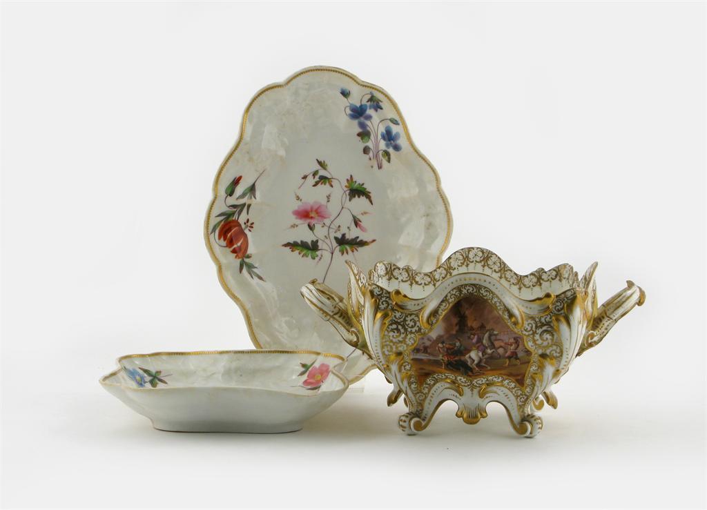 A Dresden porcelain square basket, painted with figures and horses on a yellow ground, the interior with flowers, and two Chamberlain's Worcester shaped dishes painted with flowers, 19th century, 29cm max. (3)