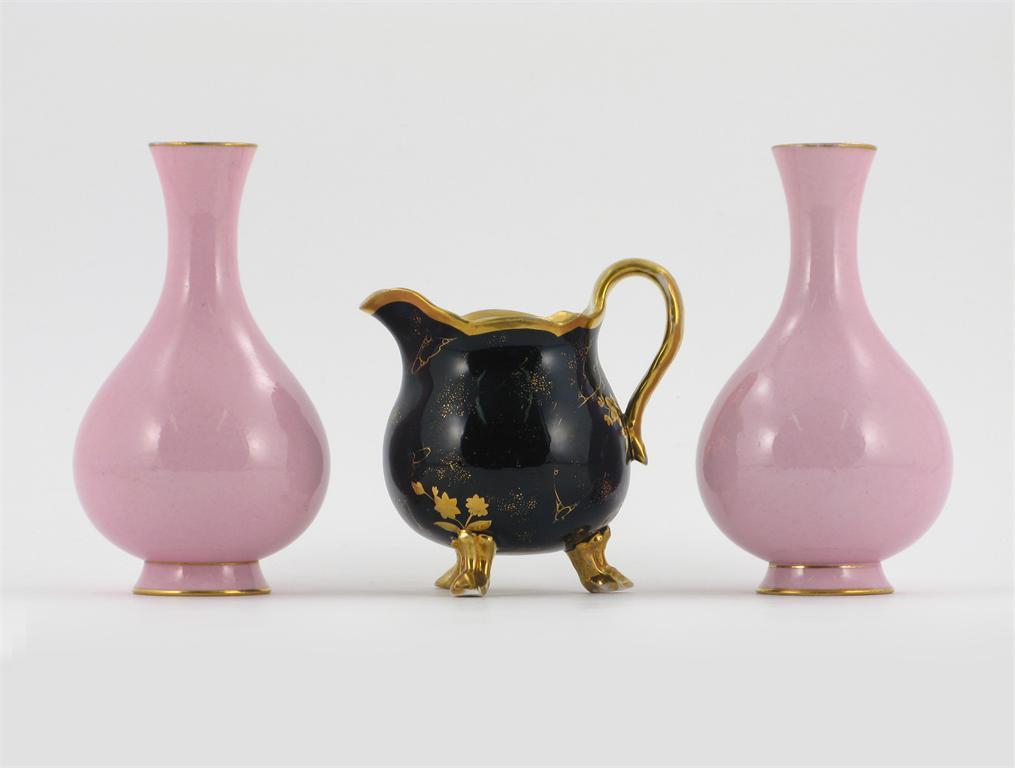 A pair of Sèvres vases, decorated all over with a pale pink glaze, printed marks and date codes for 1894, and a small three-footed jug with gilt flower sprays over a deep blue ground, 15.2cm. (3)
