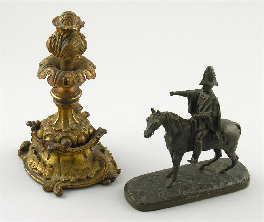 A 19th century equestrian bronze, the detachable seated figure being Wellington, the base inscribed 'Boyer,' 5.75in (14.5cm) h, and two 19th century gilt brass mounts. (3)