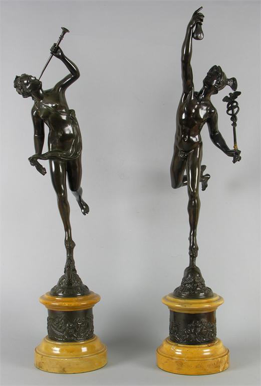 A pair of late 19th century bronze figures, Mercury after Giambologna, the base of the caduceus is broken, 26in (66cm) h, and Victory, 24.25in (61.5cm) h, both on Siena marble bases with putto decorated centres. (2)