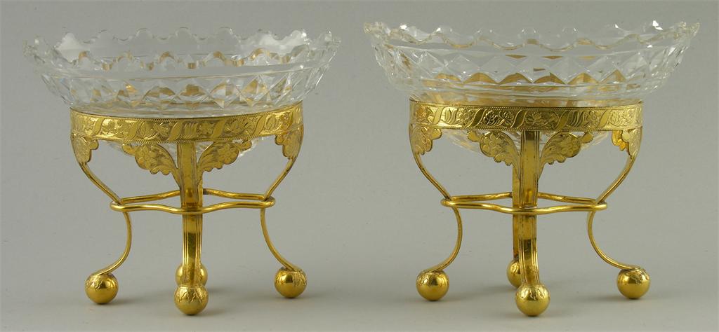 A pair of George III copper gilt sweetmeat dishes, with engraved decoration, ball feet and cut glass liners with shaped rims, c.1805, 6.2in (16cm) wide. (2)