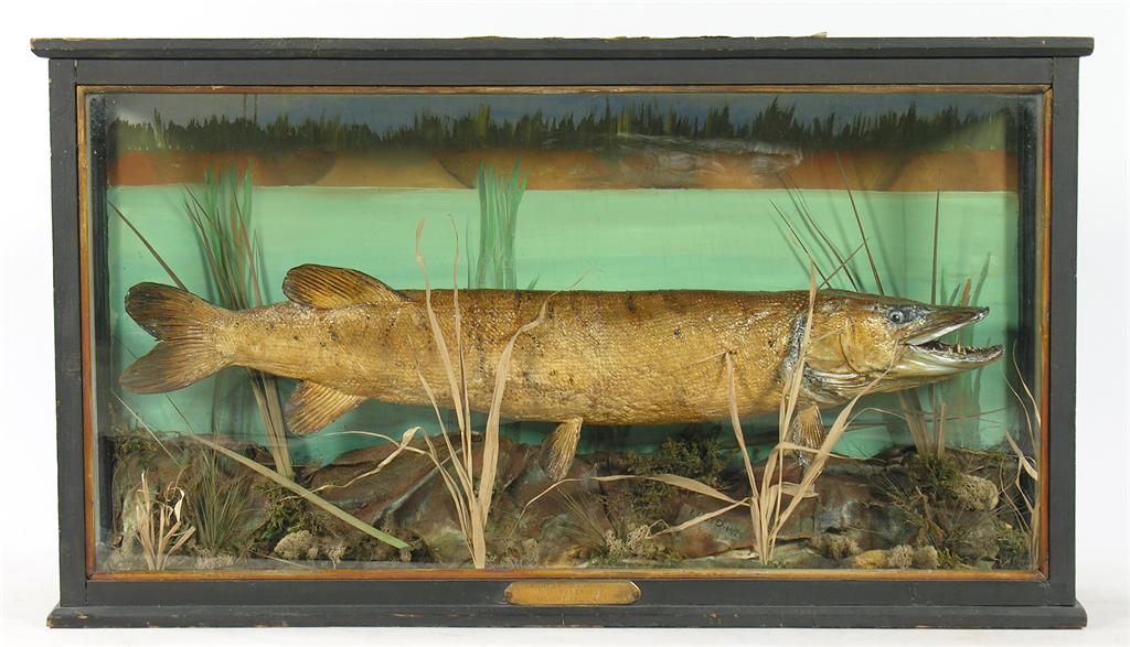 A cased pike, with a brass plaque inscribed 'Caught by Jack Payne, 31st October 1925, Weight 19LBS 4oz', the naturalistic base inscribed 'LLYOD 1925', 26.25in (66.6cm) h, 46.25in (117.4cm) w, 10.5in (26.6cm) d.