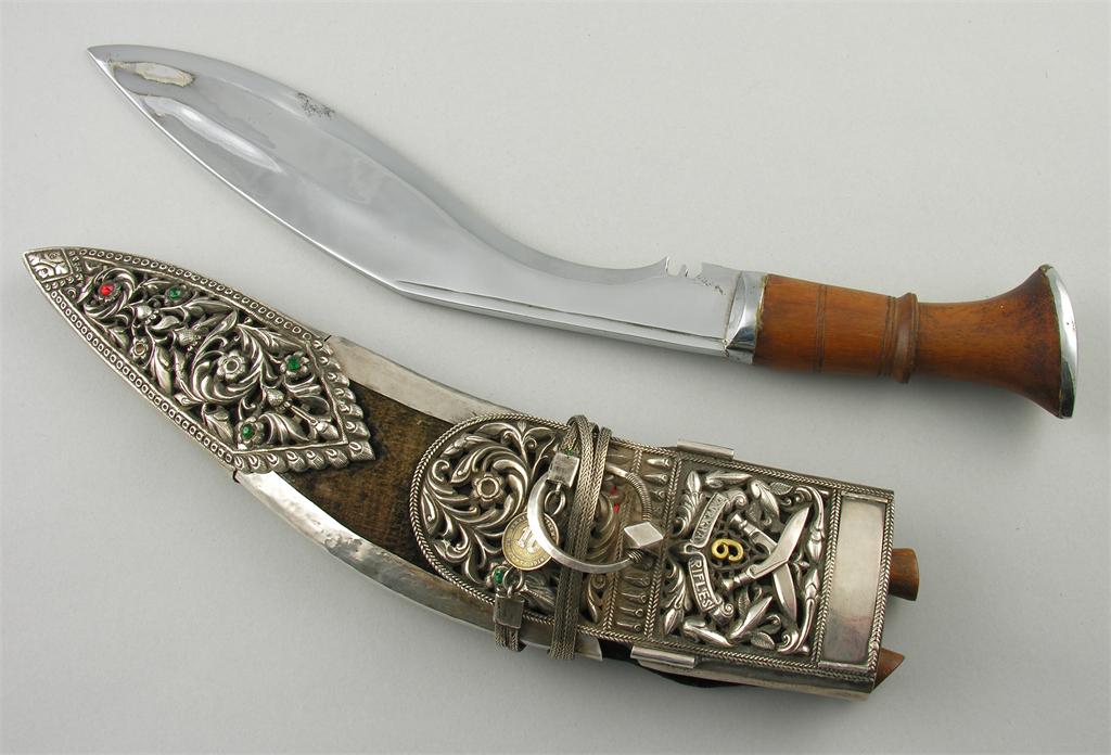A kukuri, the pierced silver coloured metal mounted scabbard with '6 GURKHA RIFLES' to the top, above applied coloured beads, with two small knives, 17in (43cm) l. in scabbard.