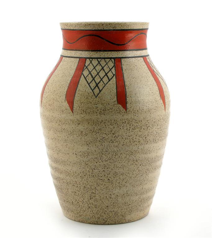'Goldstone' a Clarice Cliff Bizarre Isis vase, painted to the shoulder and neck with a geometric design in coral red, on a speckled brown ground printed and painted marks 25cm. high