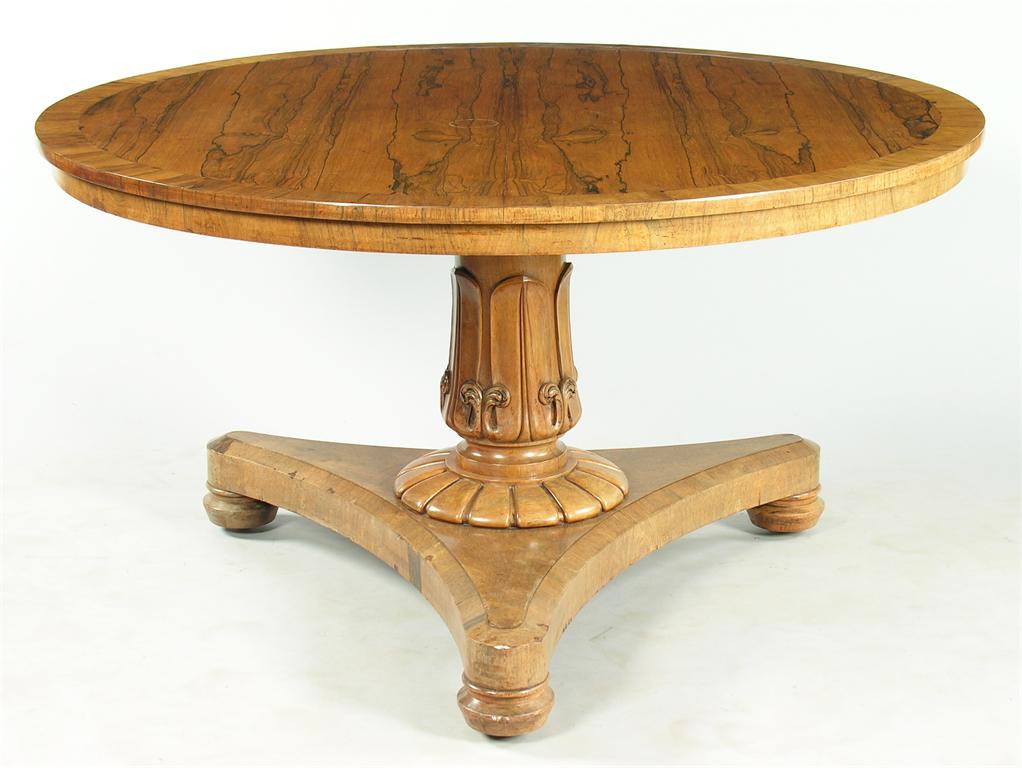 A George IV rosewood centre table, the circular crossbanded tilt-top on a turned and carved lappet and foliage stem, to a faceted triform base with turned feet and sunken brass castors, 29in (73.5cm) h, 52in (132cm) dia. Old restoration.
