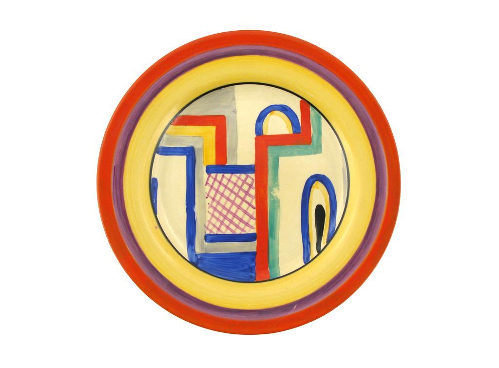 'Tennis' a Clarice Cliff Bizarre side plate, painted in colours inside yellow, purple and red bands printed factory mark, minor overpainting to red band 17.5cm. diam.