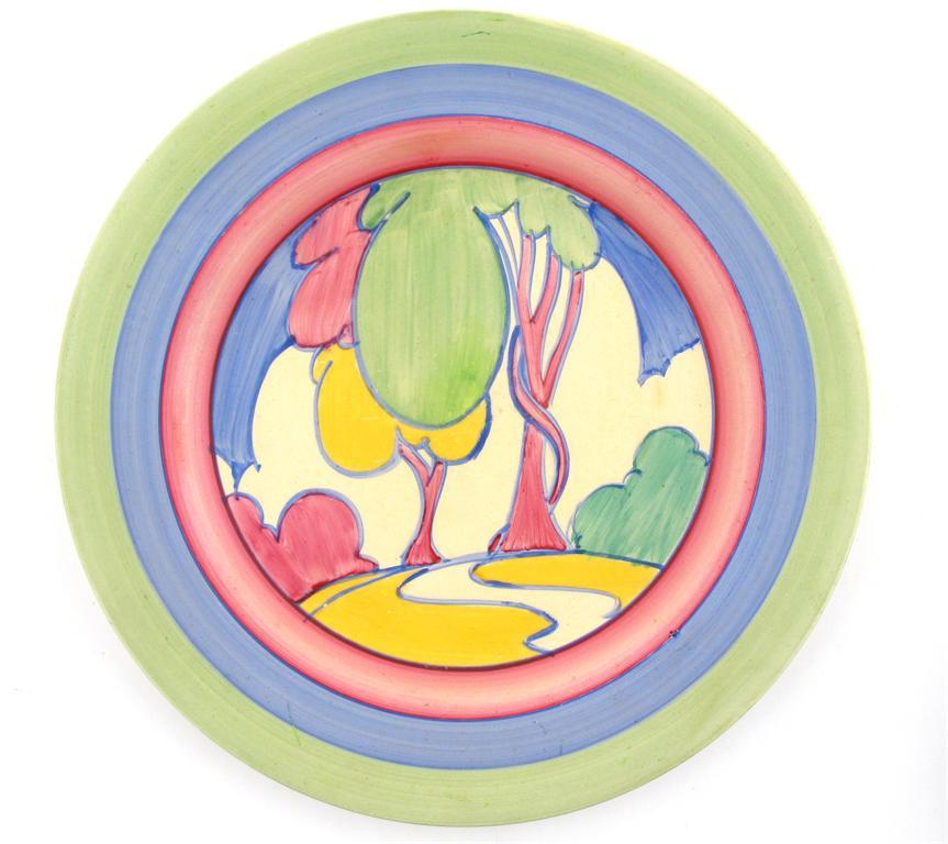'Pastel Trees and House' a Clarice Cliff Fantasque Bizarre plate painted in colours inside green