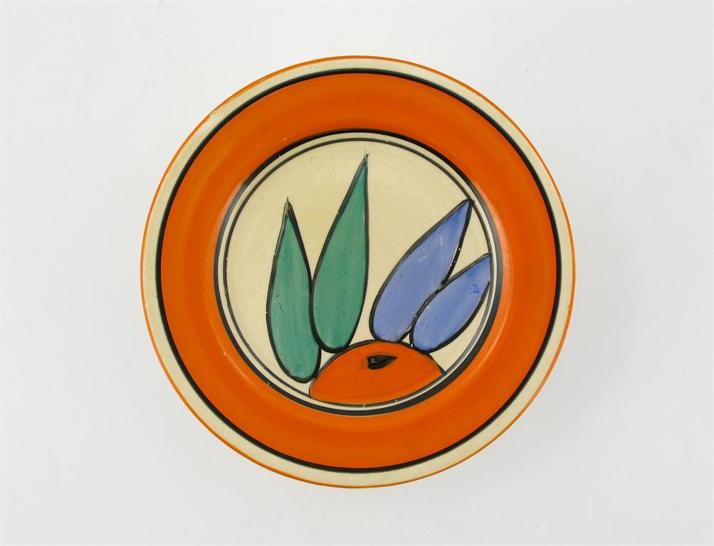 'Oranges' a Clarice Cliff Bizarre side plate painted in colours inside orange band printed...