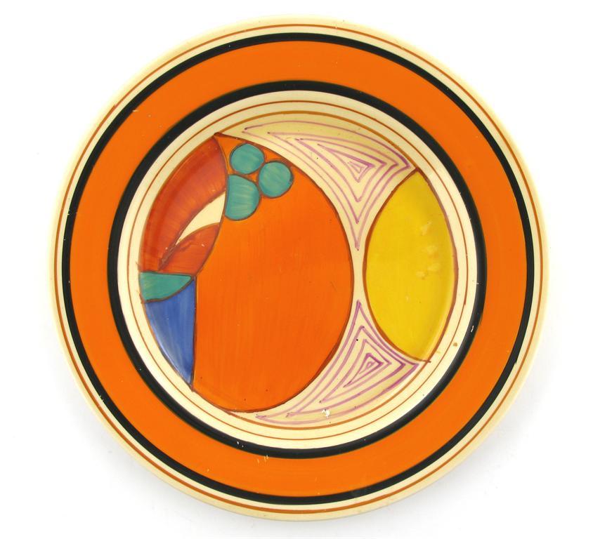 'Melon' a Clarice Cliff Fantasque Bizarre plate, painted in colours inside orange and black bands printed factory marks 22.5cm. diam.