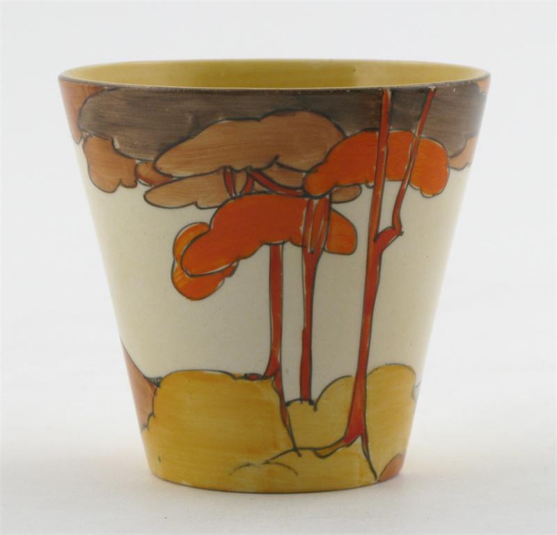 'Coral Firs' a Clarice Cliff Bizarre flaring beaker, painted in colours printed factory mark 7cm. high