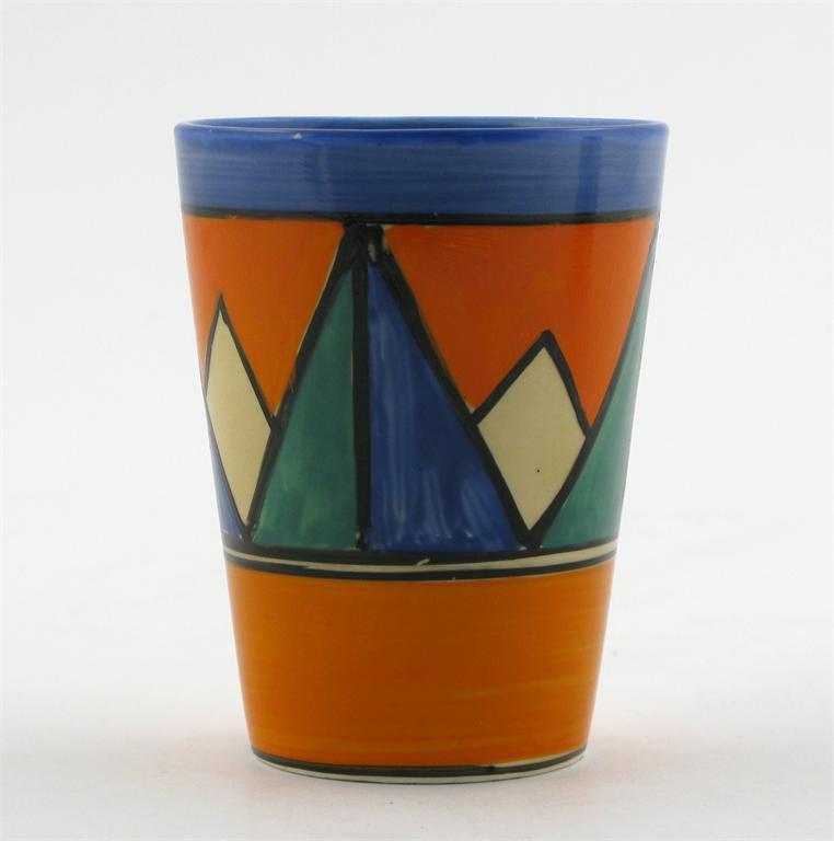 'Original Bizarre' a Clarice Cliff Bizarre beaker, painted with blue and green triangles, between orange and blue bands printed factory marks 9.5cm. high