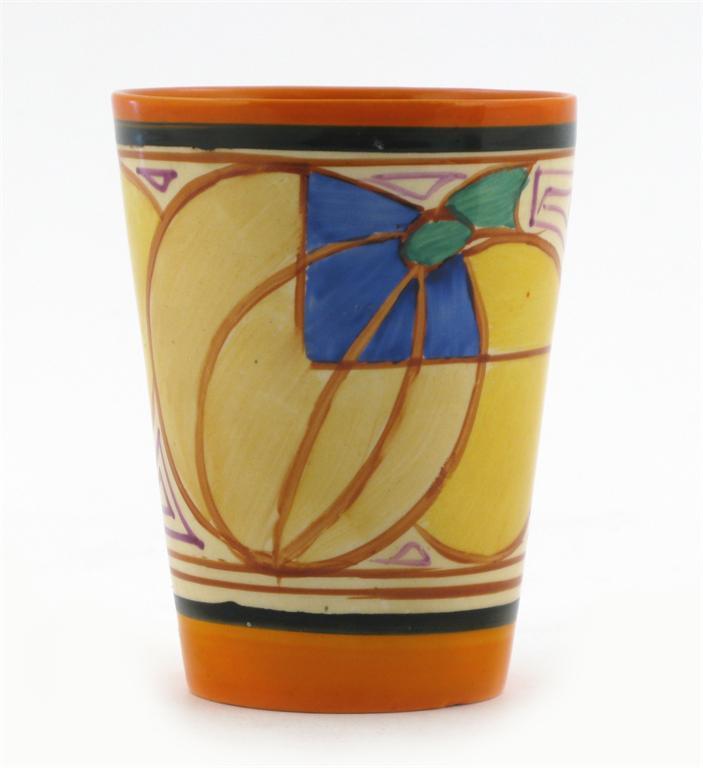 'Melon' a Clarice Cliff Bizarre beaker, painted in colours printed factory marks, restored orange band to top rim 9.5cm. high