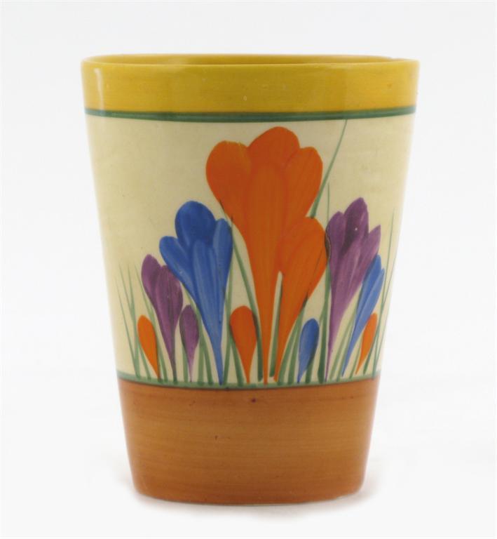 'Crocus' a Clarice Cliff Bizarre beaker painted in colours between yellow and brown bands...