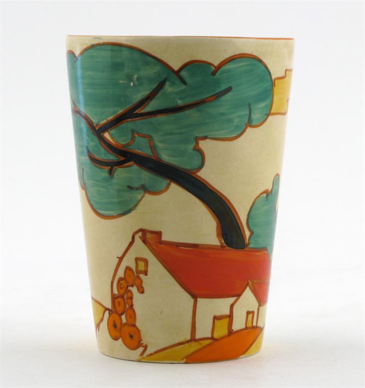 'Red Roofs' a large Clarice Cliff Fantasque Bizarre beaker painted in colours printed factory...