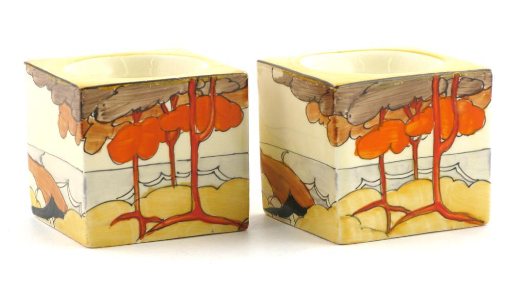 'Coral Firs' a pair of Clarice Cliff 658 Cube candlesticks, painted in colours printed factory marks 6cm. high