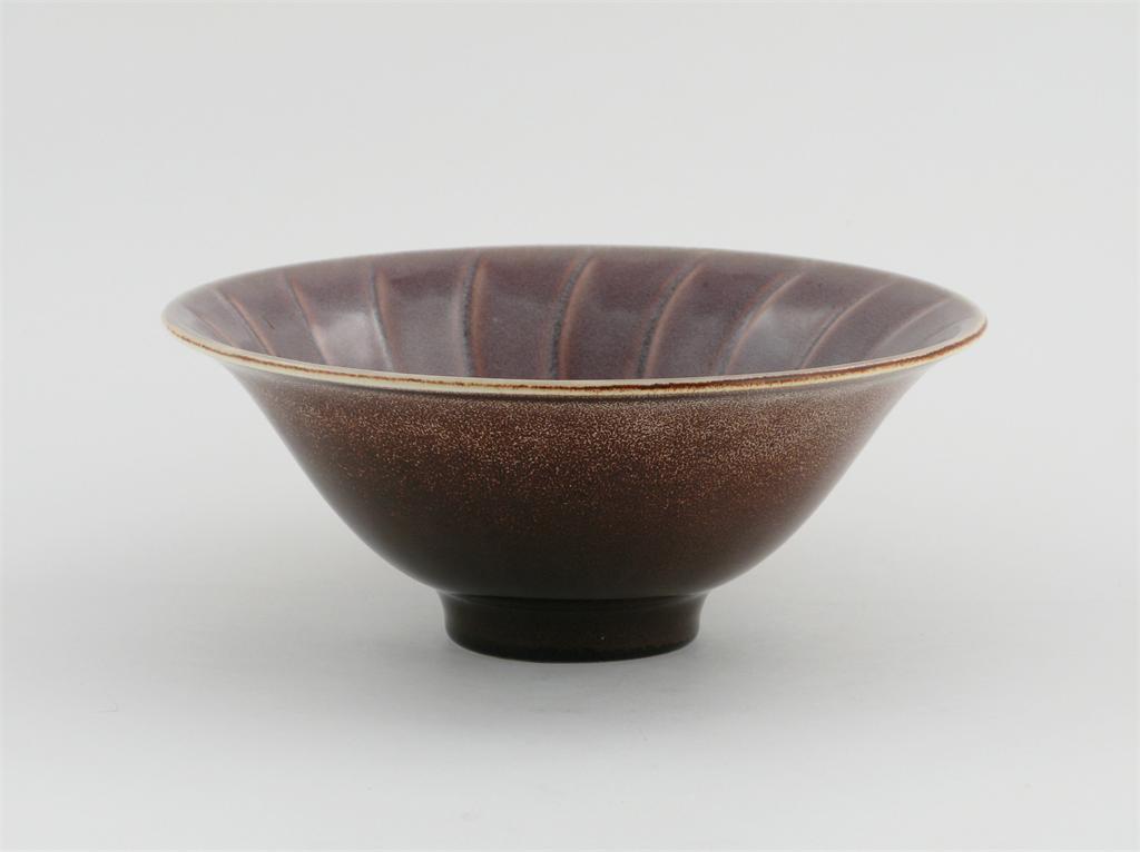 A Wedgwood earthenware bowl by Norman Wilson, the exterior glazed speckled brown, the interior with light flutes, glazed mottled pink impressed marks, 20.5cm. diam.