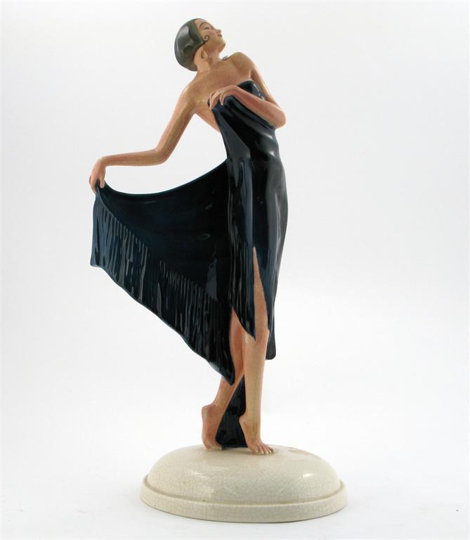 A large Crown Devon figure of a woman in a blue shawl painted in colours printed factory marks...