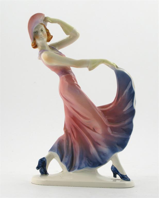 A Continental Pottery figure of a woman in a pink flowing dress impressed and printed marks 31cm....