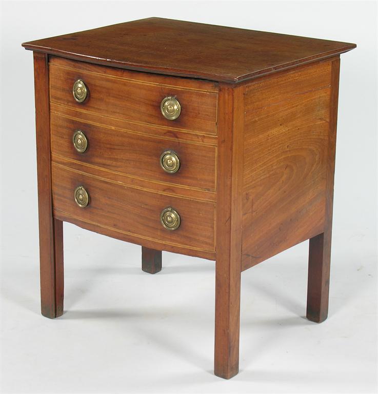 A George III mahogany barrel front commode, the hinged top to a shaped aperture, the false drawer front with brass plate handle, rising and falling on an internal counter balance, on square legs, 28.75in (73cm) h, 25.75in (65.4cm) w, 21.25in (54cm) d.