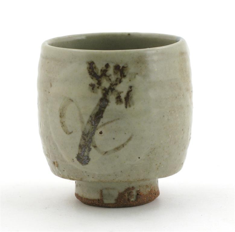a stoneware unomi, glazed to the foot, painted with a foliate stem in tenmoku, indistinct personal seal and a Leach Pottery seal mark 9.5cm. high