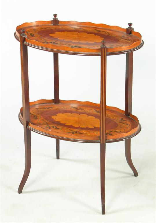 A late Victorian two tier mahogany and marquetry inlaid tagre