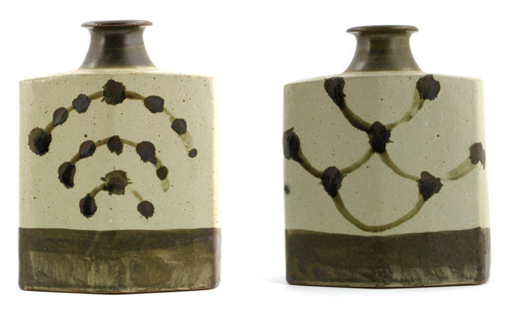 a stoneware vase, chamfered rectangular section, painted with simple brush and finger print motif in olive on a celadon ground unsigned 21cm. high