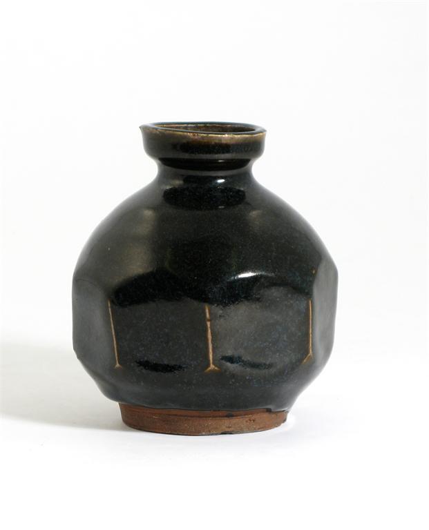 a rare Leach Pottery stoneware vase, cut-sided form with collar rim, covered to the foot with a dark tenmoku glaze speckled with blue impressed seal marks 13cm. high