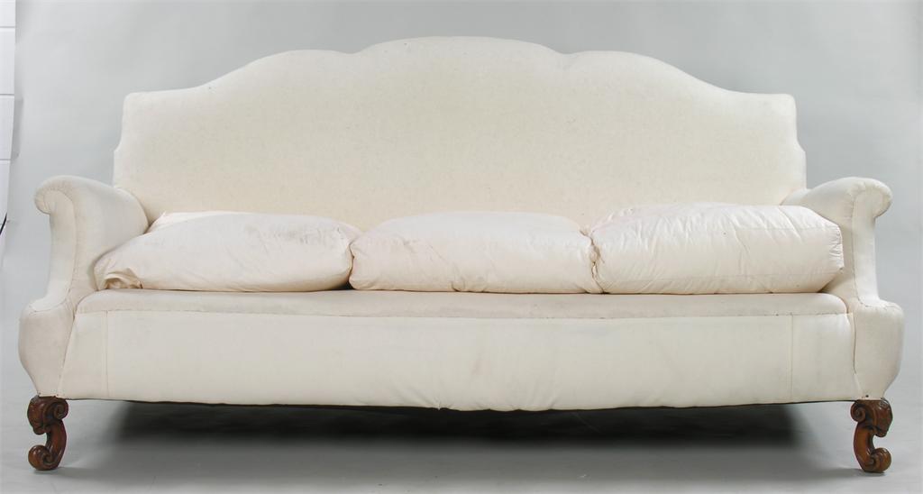A Howard & Son three seater settee, the shaped back to scroll arms and six loose cushions, on carved walnut scroll front legs, one back leg stamped '1689, 3663, HOWARD & SONS LTD BERNER ST', 36.5in (92.6cm) h, 75.5in (192cm) w, 38.5in (97.7cm) d.