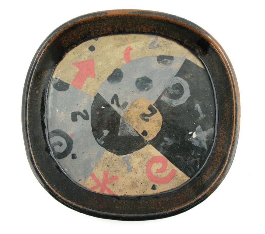 a large stoneware platter, rounded square section, the well with painted numbers and geometric design painted Maltby 34.5cm. diam.