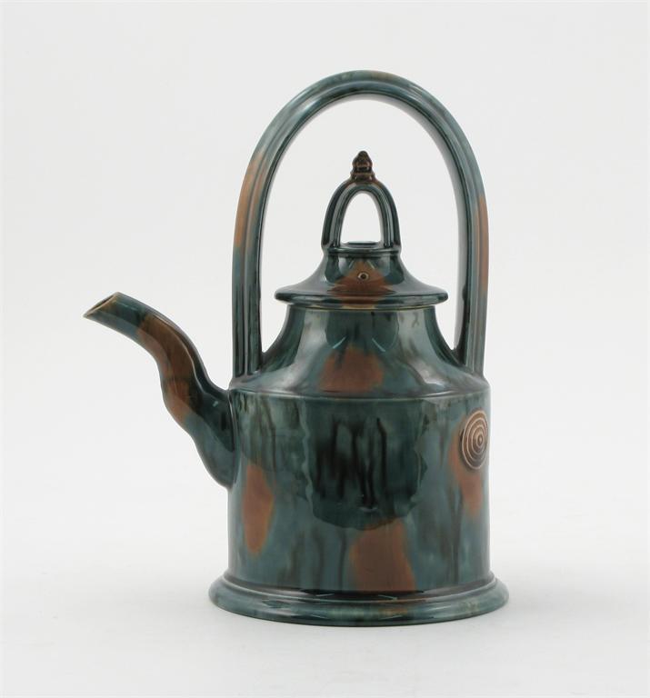 an earthenware Whielden teapot, with overslung handle, glazed in running blue-green with brown spots, applied seal mark 22cm. high