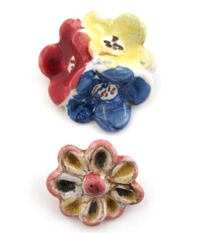 a button and a brooch, each modelled as flowerheads, glazed in colours on a white ground unsigned brooch 5cm. wide