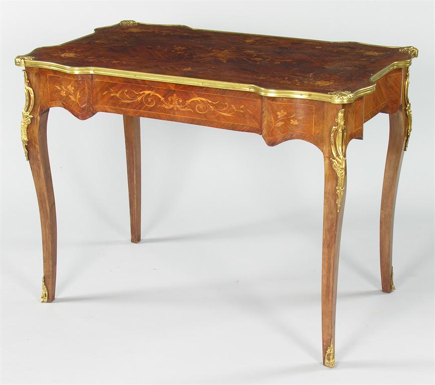 A French kingwood and marquetry inlaid centre table, with gilt brass mounts the shaped top above a central frieze drawer, on square cabriole legs, 29.5in (75cm) h, 39.75in (101cm) w, 25in (63.5cm) d.